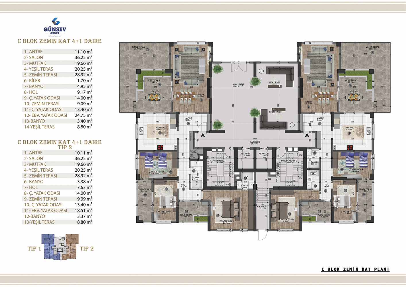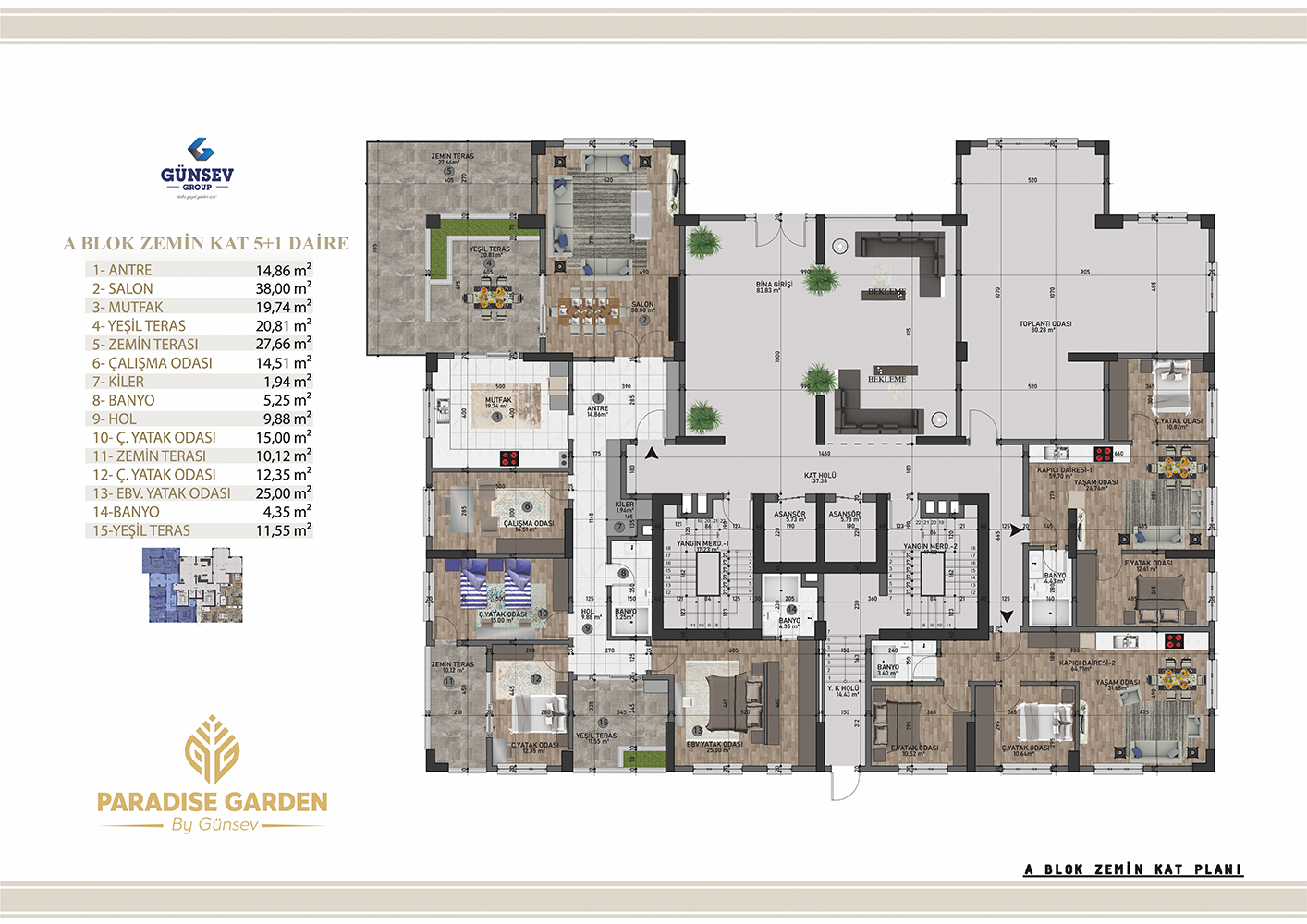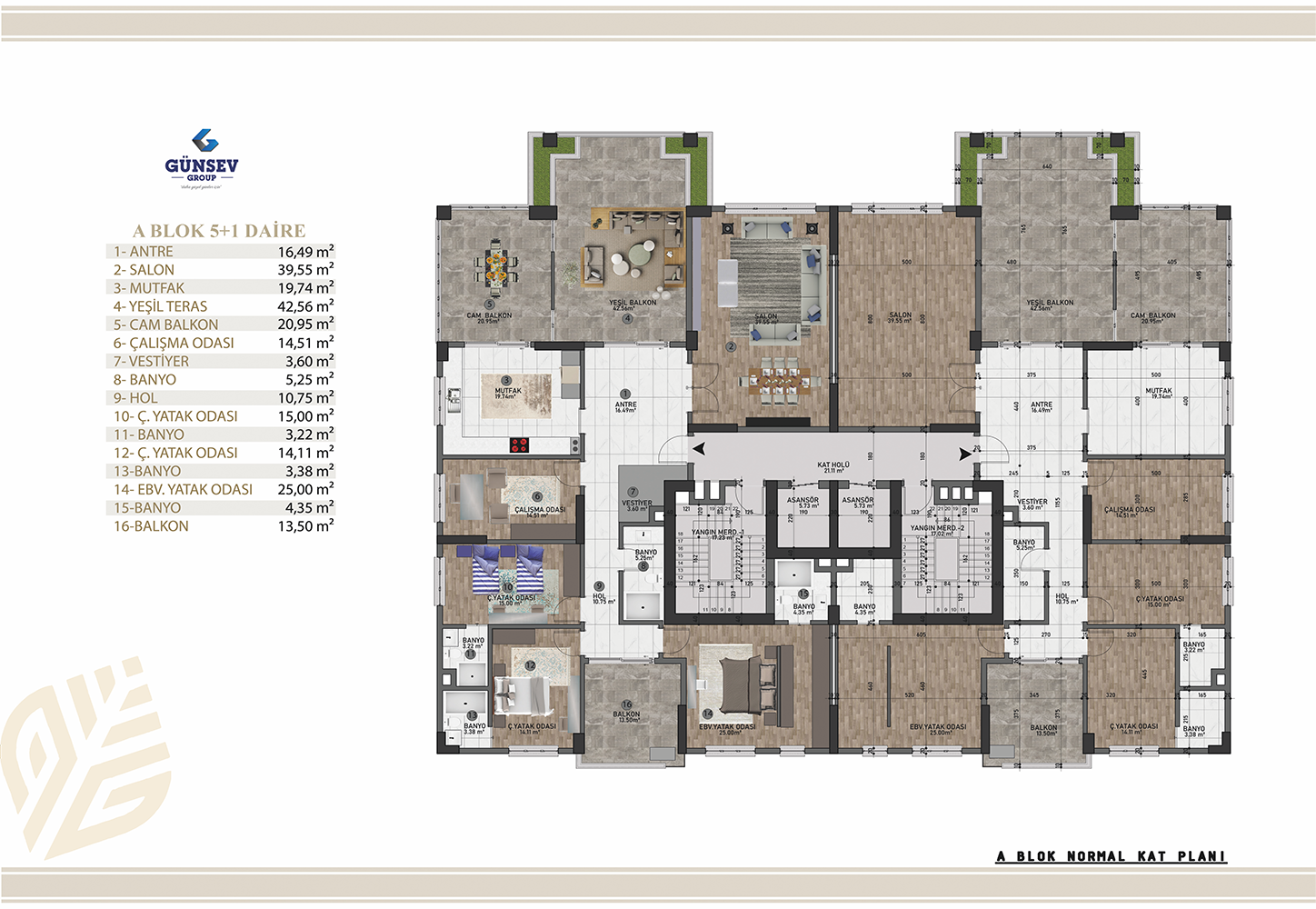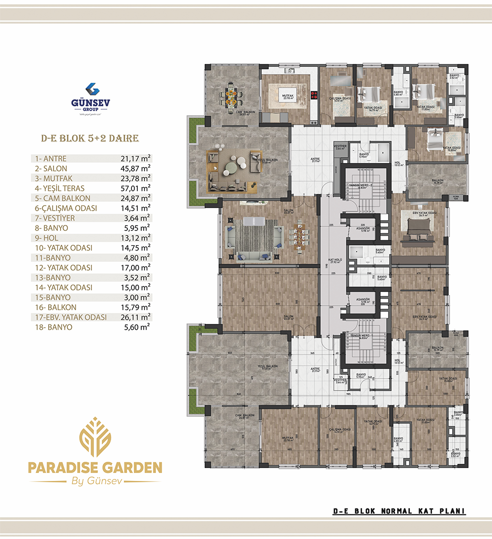 4+1 dairelerimiz 284 m2, 5+1 dairelerimiz 312 m2, 5+2 dairelerimiz 387 m2.