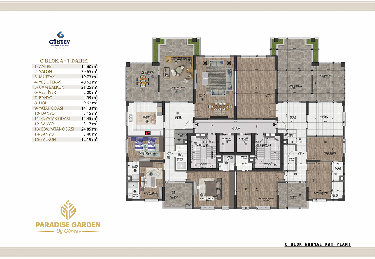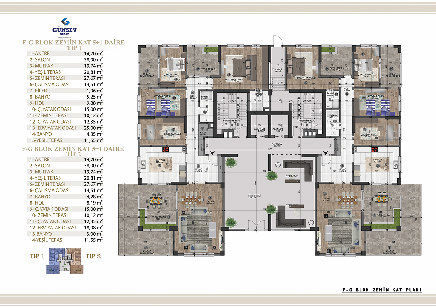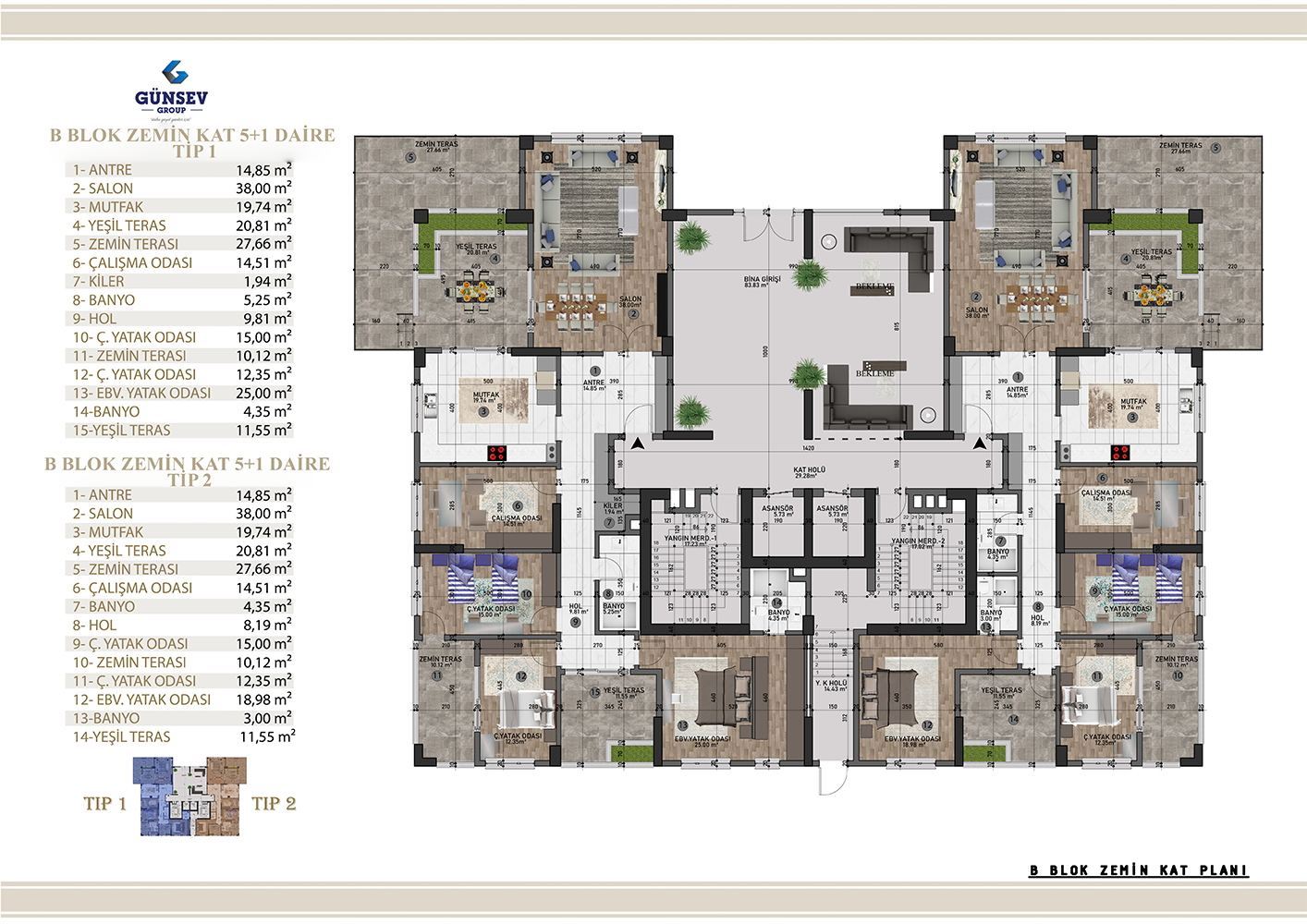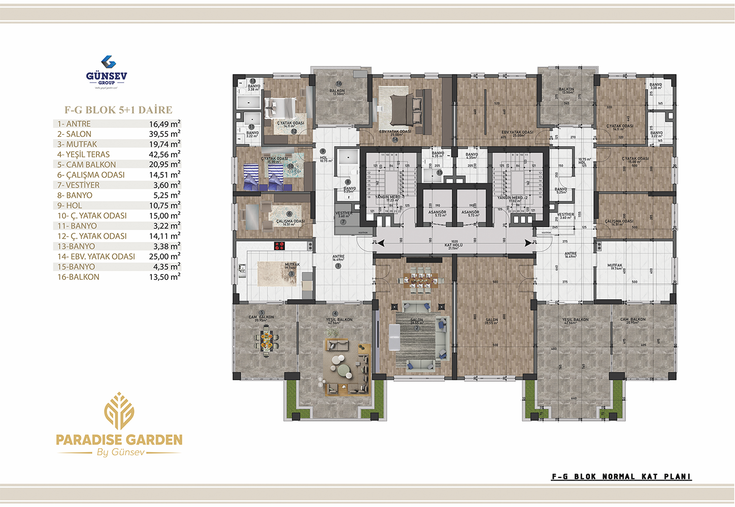 4+1 dairelerimiz 284 m2, 5+1 dairelerimiz 312 m2, 5+2 dairelerimiz 387 m2.